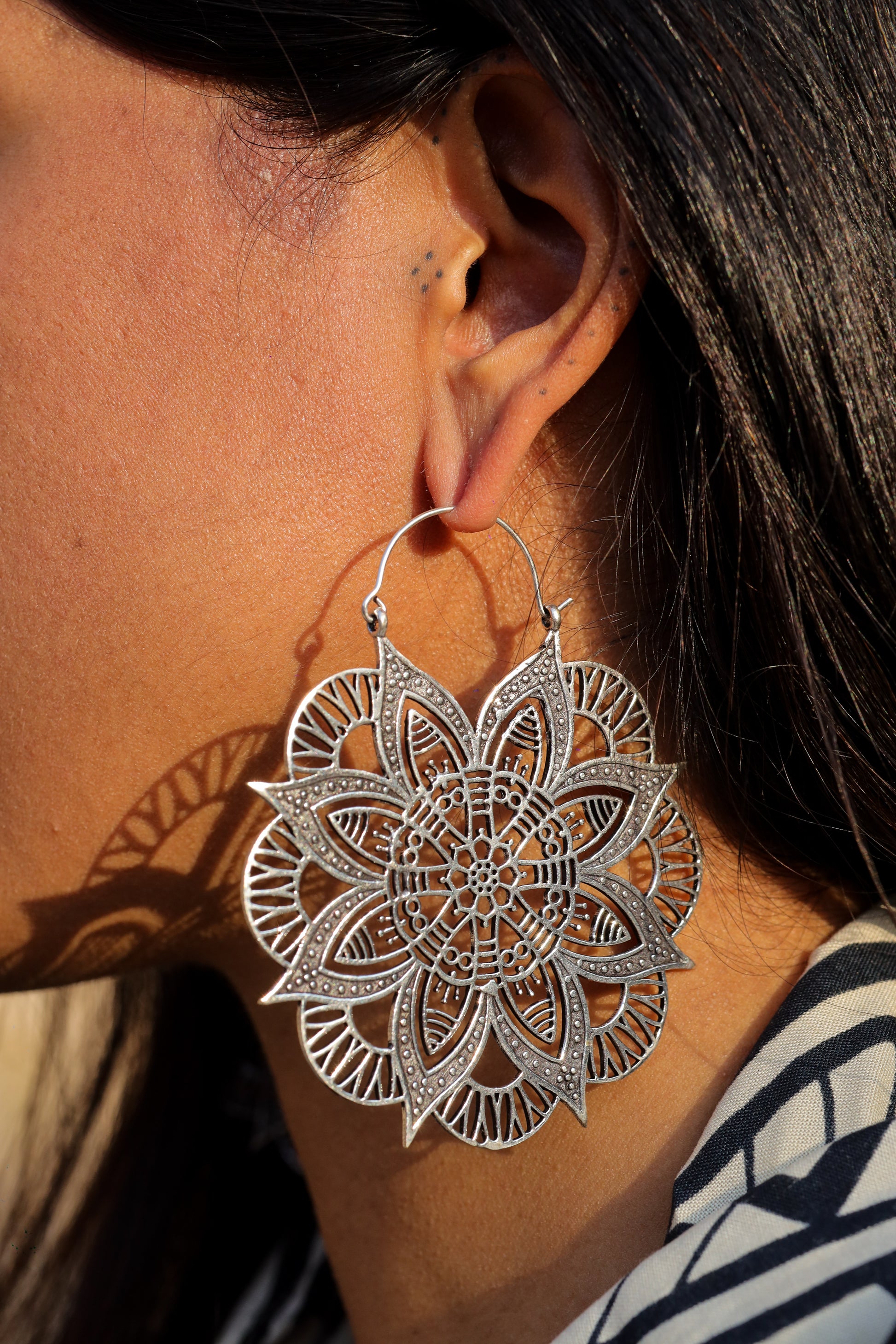 Grandes boucles d’oreilles Mandala Fleur en laiton plaqué argent