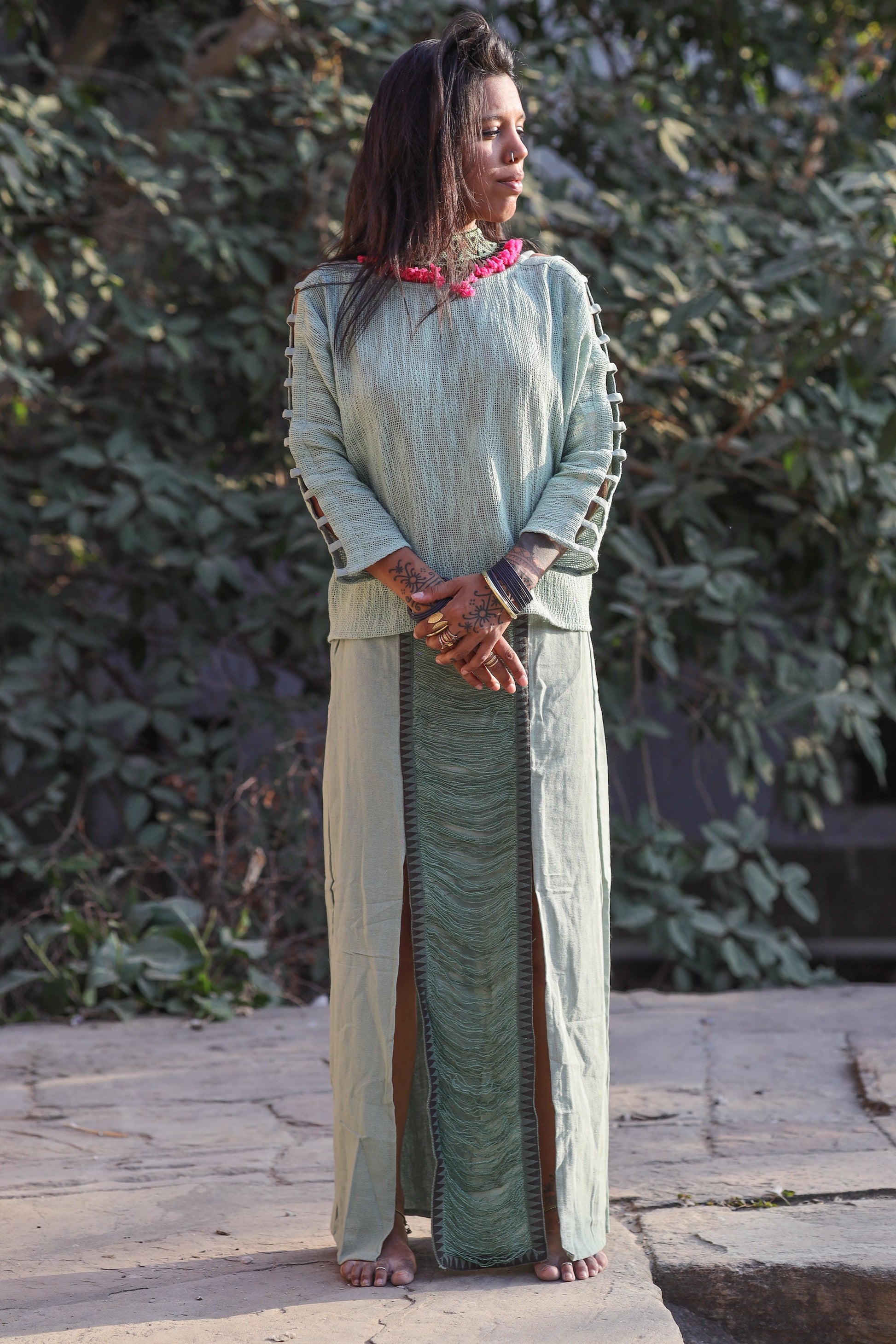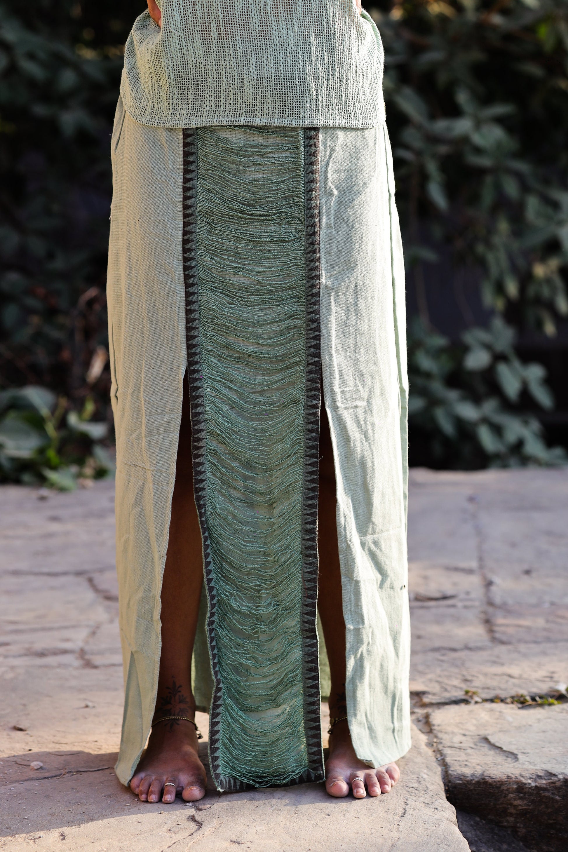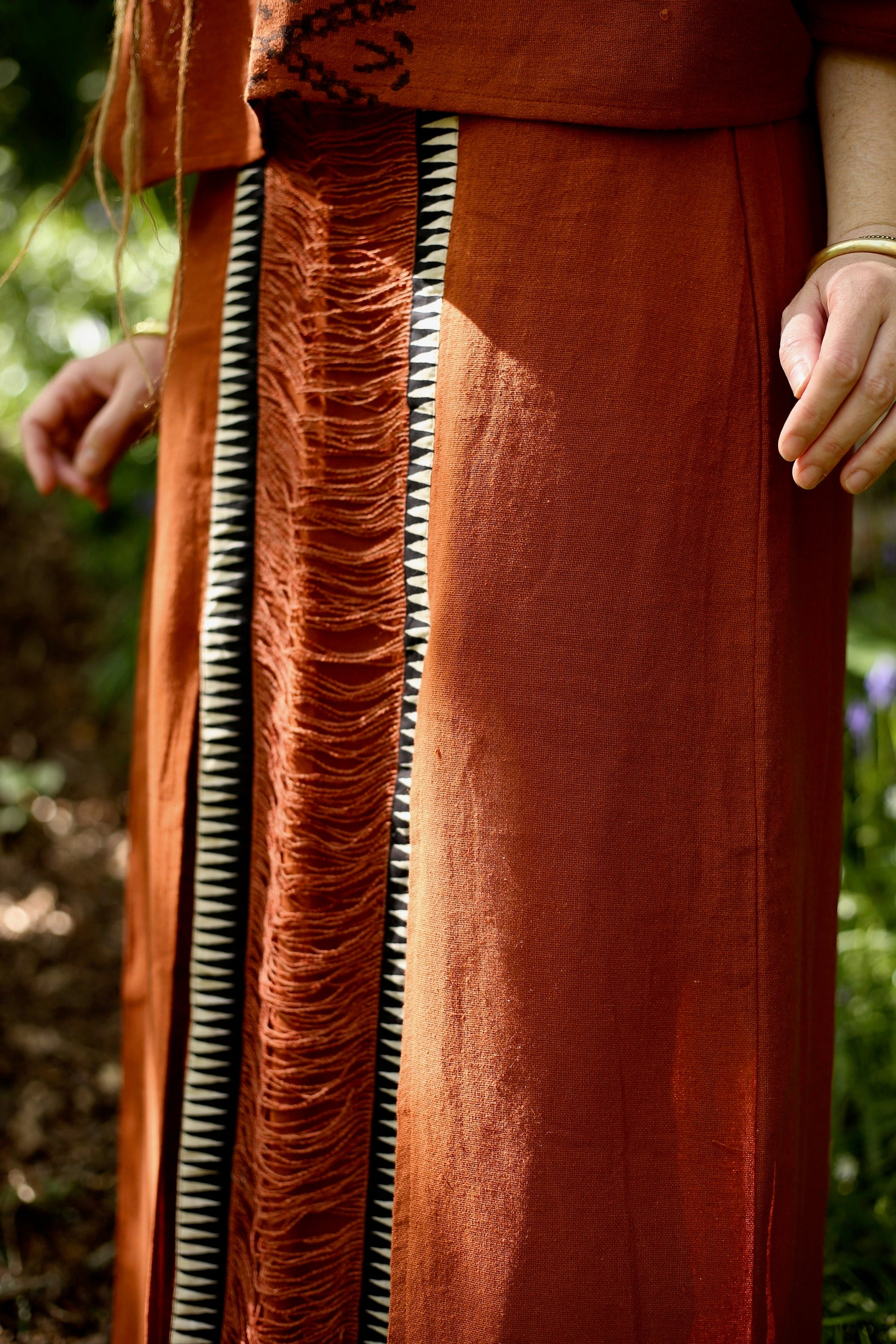 Jupe longue en jute de coton – Détail imprimé tribal & ouverture élégante