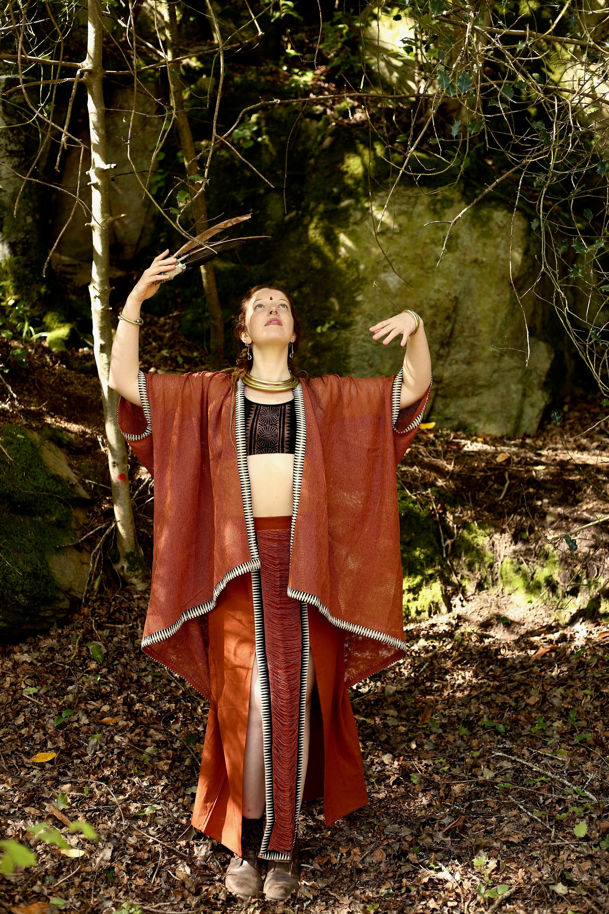 Cette jupe longue en jute de coton allie confort et style avec sa coupe fluide, son ouverture au-dessus des genoux et son détail imprimé tribal inspiré des traditions ancestrales.