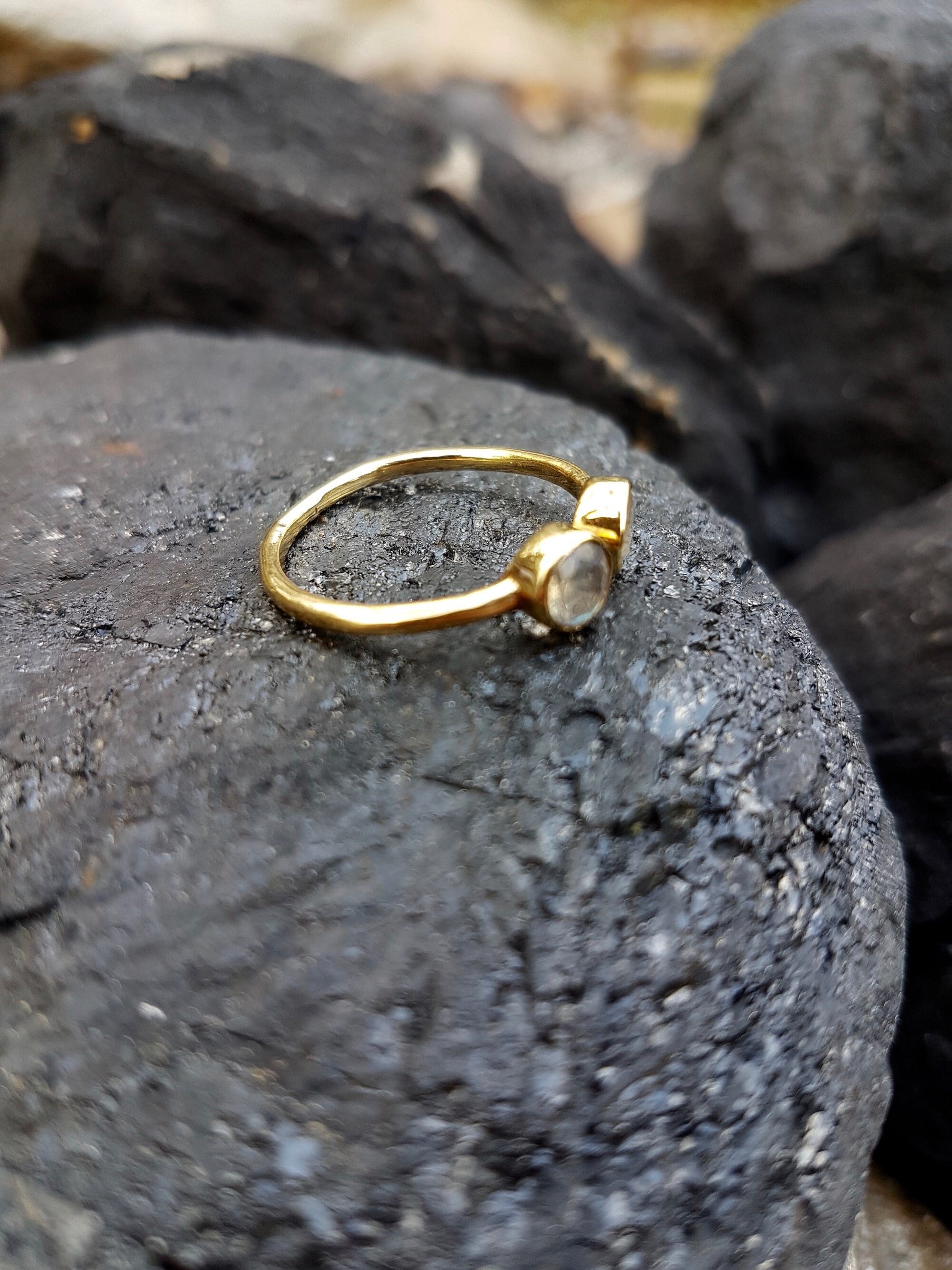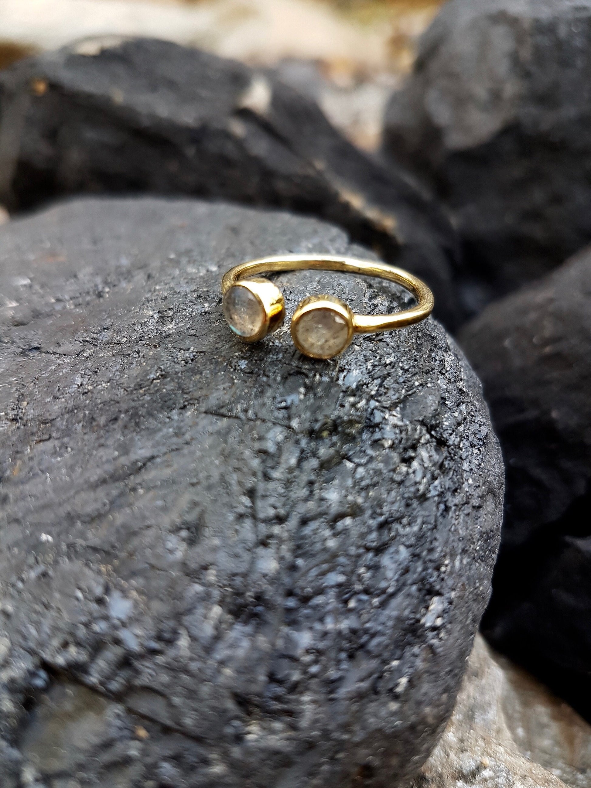 Cette jolie bague en laiton est ornée de deux pierres de labradorite, cette pierre a des reflets bleu/vert lorsqu' elle est au soleil.